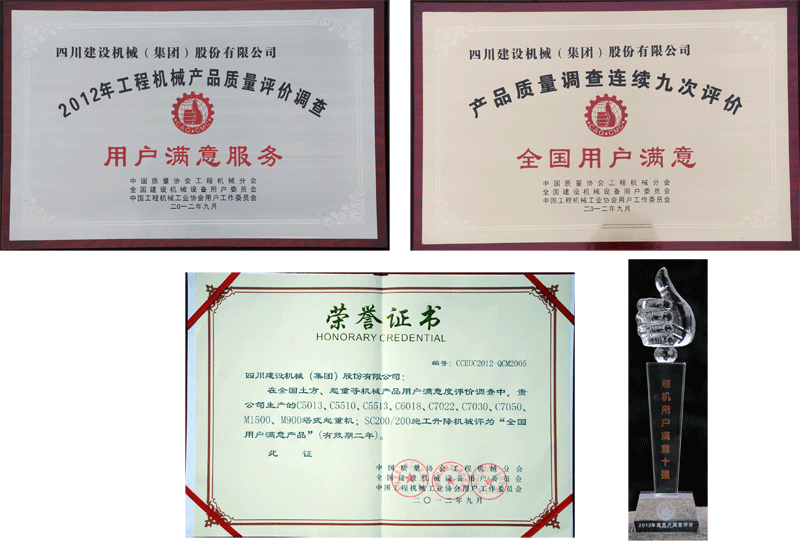 會(huì)議上,侯寶佳秘書(shū)長(zhǎng)公布了用戶(hù)滿(mǎn)意產(chǎn)品、滿(mǎn)意服務(wù)企業(yè)及塔機(jī)用戶(hù)滿(mǎn)意十強(qiáng)等評(píng)選名單,對(duì)到會(huì)的企業(yè)代表及個(gè)人進(jìn)行了現(xiàn)場(chǎng)表彰,并對(duì)連續(xù)三次以上獲得用戶(hù)滿(mǎn)意產(chǎn)品稱(chēng)號(hào)的企業(yè)進(jìn)行表彰。四川建設(shè)機(jī)械(集團(tuán))股份有限公司在2012年工程機(jī)械產(chǎn)品質(zhì)量評(píng)價(jià)調(diào)查中獲得“用戶(hù)滿(mǎn)意服務(wù)”,迄今為止已經(jīng)是(集團(tuán))公司產(chǎn)品“質(zhì)量調(diào)查連續(xù)九次評(píng)價(jià)全國(guó)用戶(hù)滿(mǎn)意”。公司生產(chǎn)的C5013、C5510、C5513、C6018、C7022、C7030、C7050、M900、M1500塔式起重機(jī)以及SC200/200施工升降機(jī)被評(píng)為“全國(guó)用戶(hù)滿(mǎn)意產(chǎn)品”。同時(shí),協(xié)會(huì)在用戶(hù)滿(mǎn)意產(chǎn)品的基礎(chǔ)上評(píng)選出2012年塔式起重機(jī)行業(yè)“全國(guó)塔機(jī)用戶(hù)滿(mǎn)意十強(qiáng)”企業(yè),包括四川建設(shè)機(jī)械(集團(tuán))股份有限公司、撫順永茂建筑機(jī)械有限公司、中聯(lián)重科股份有限公司、廣西建工集團(tuán)建筑機(jī)械制造有限責(zé)任公司、北京永茂建工機(jī)械制造有限公司、沈陽(yáng)三洋建筑機(jī)械有限公司、浙江省建設(shè)機(jī)械集團(tuán)有限公司、湖北江漢建筑工程機(jī)械有限公司、浙江虎霸建設(shè)機(jī)械有限公司、江蘇正興建設(shè)機(jī)械有限公司。