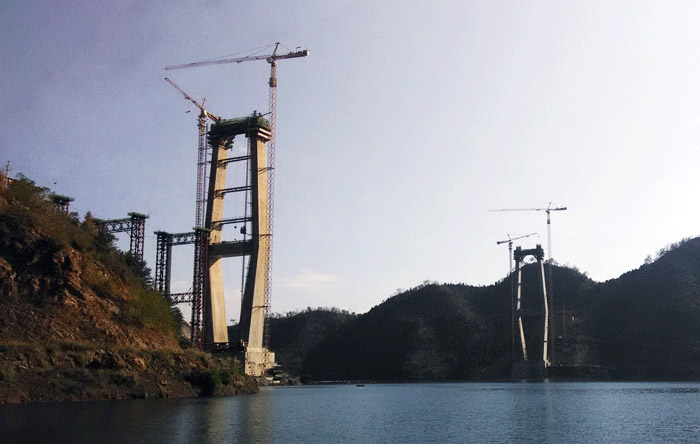 紅水河特大橋兩側(cè)橋墩高度均為210米,每個橋墩的起重機(jī)械配置均為川建生產(chǎn)的一臺C7036塔機(jī)、一臺C7030塔機(jī)和兩臺SC200/200WPZ中速變頻施工梯,副墩的施工機(jī)械為一臺P125平頭式塔機(jī)。