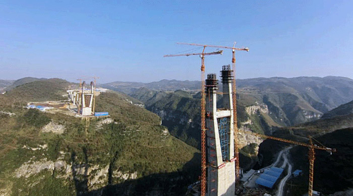 六廣河特大橋是息黔高速公路最為重要,同時也是施工難度最大的控制性工程,兩側(cè)橋墩高度均為242米,每個橋墩的起重機(jī)械配置均為川建生產(chǎn)的兩臺C7030塔機(jī)和兩臺SC200/200WPZ中速變頻施工梯。
